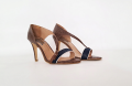 These elegant strappy heels are crafted from premium Italian leather with an exclusive ostrich-inspired finish, giving them a rich, tactile character that immediately stands out. The warm brown tone is complemented by a contrasting deep navy front strap, creating a modern, sophisticated color balance.