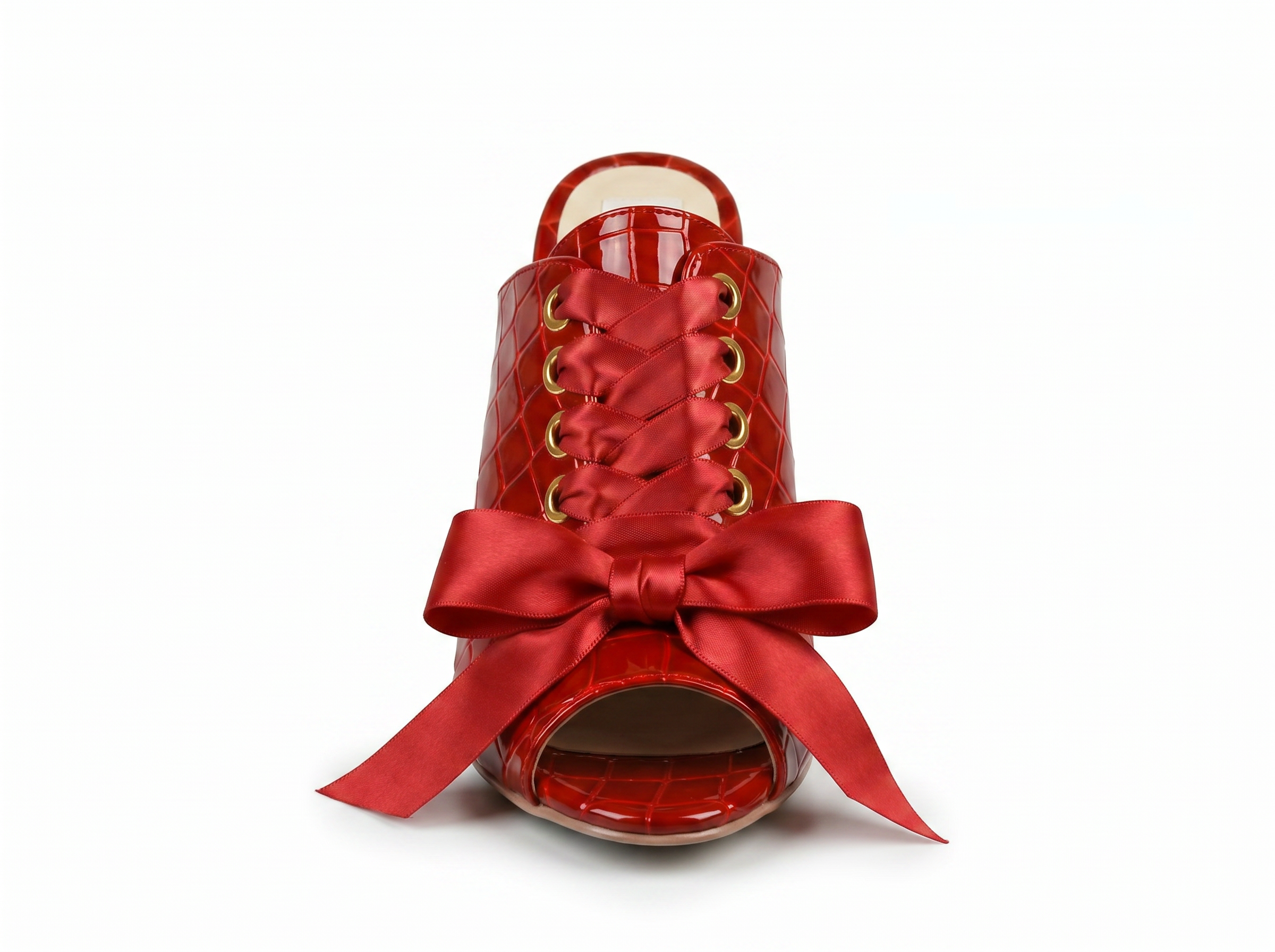 The vibrant red tone symbolizes passion and strength, while the oversized satin bow adds a dramatic yet sophisticated touch. The open-back mule silhouette combined with a sleek high stiletto heel creates a visually elongated leg line, making these shoes perfect for evening events, special occasions, and standout fashion looks.